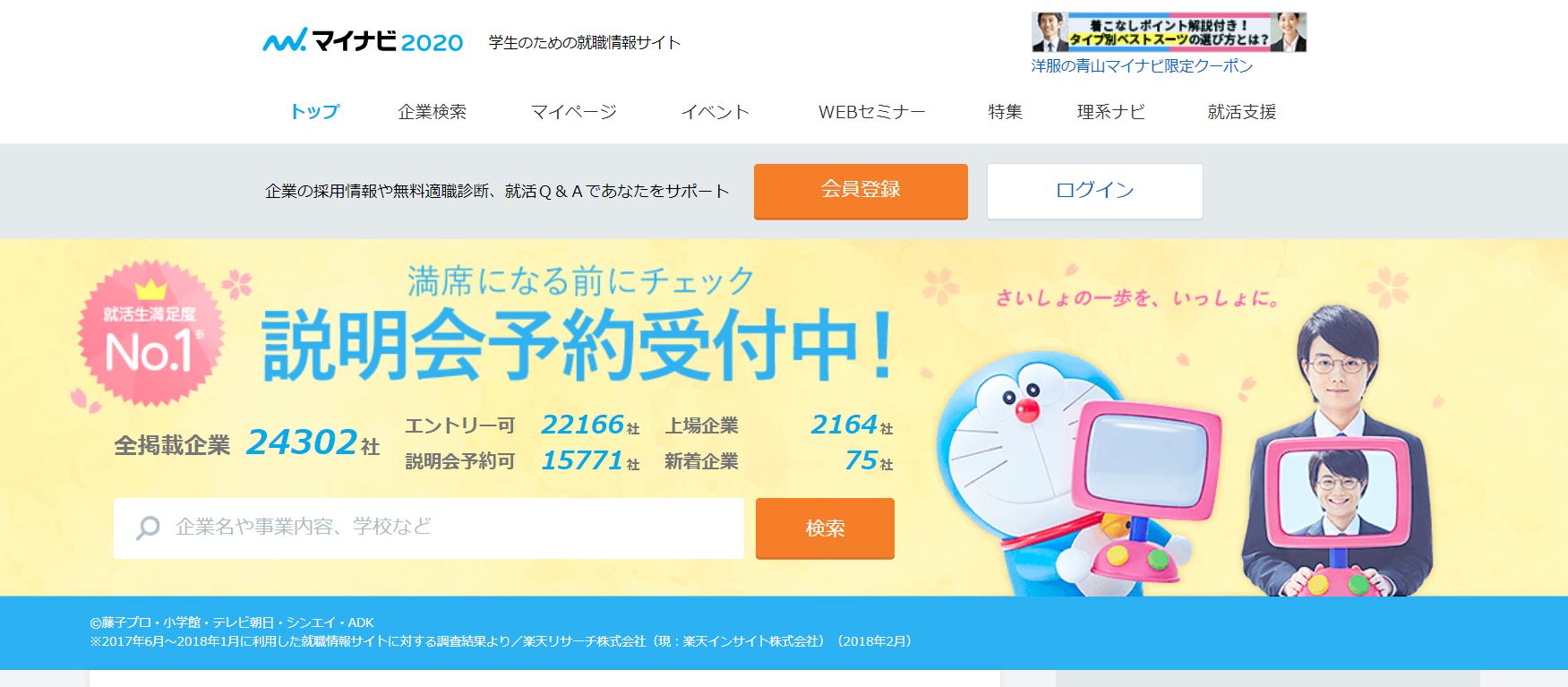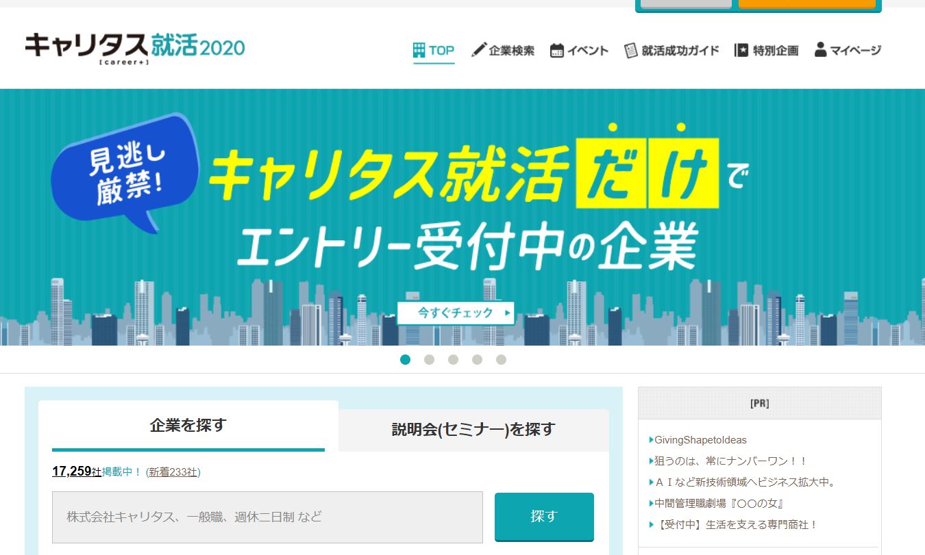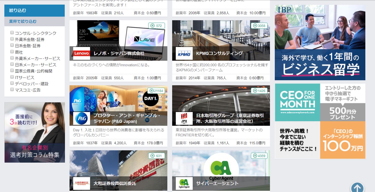 This site is as big as マイナビ however it provides information of over 30 thousands companies. I recommend you to register your membership because sometimes I could find companies couldn’t be found in マイナビ. Of course it provides events, web seminars and practice questions for web test and SPI test.